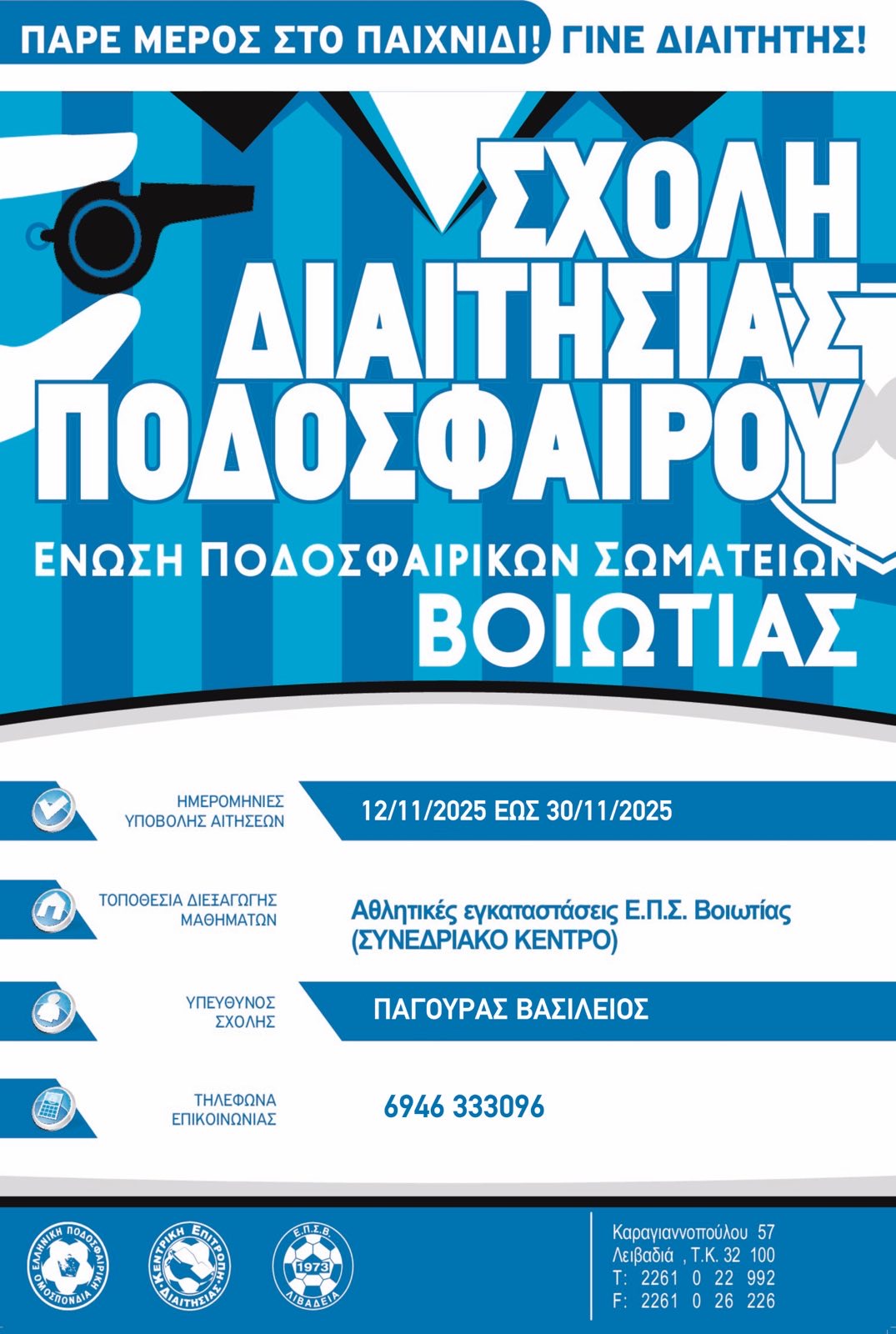 Η Επιτροπή διαιτησίας της Ε.Π.Σ.Β. διοργανώνει Σχολή Διαιτησίας .
